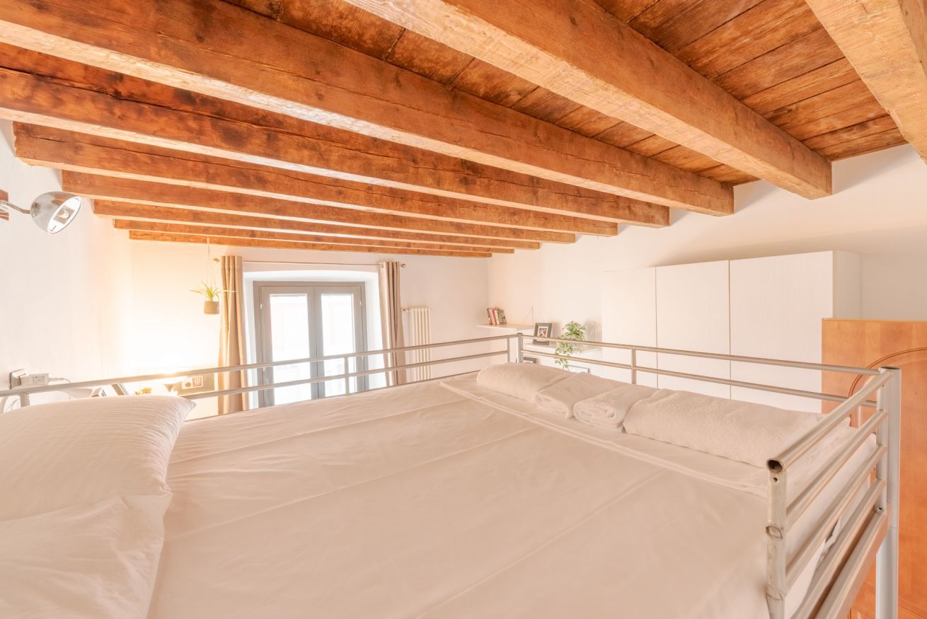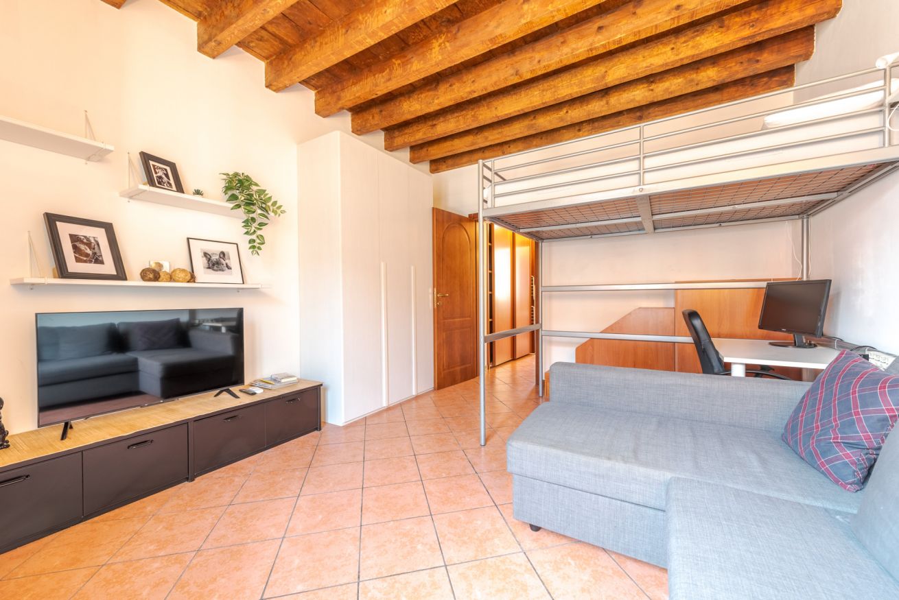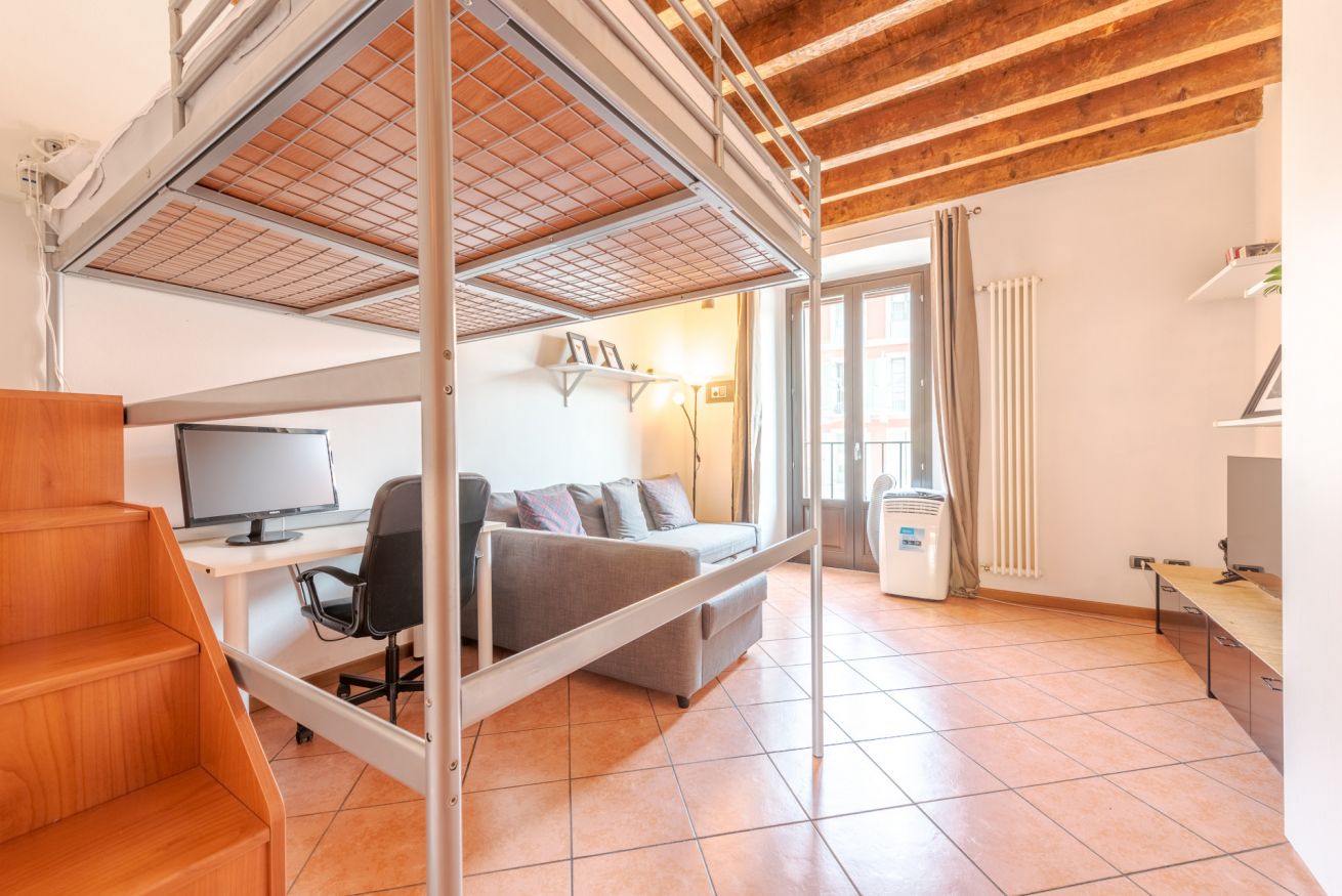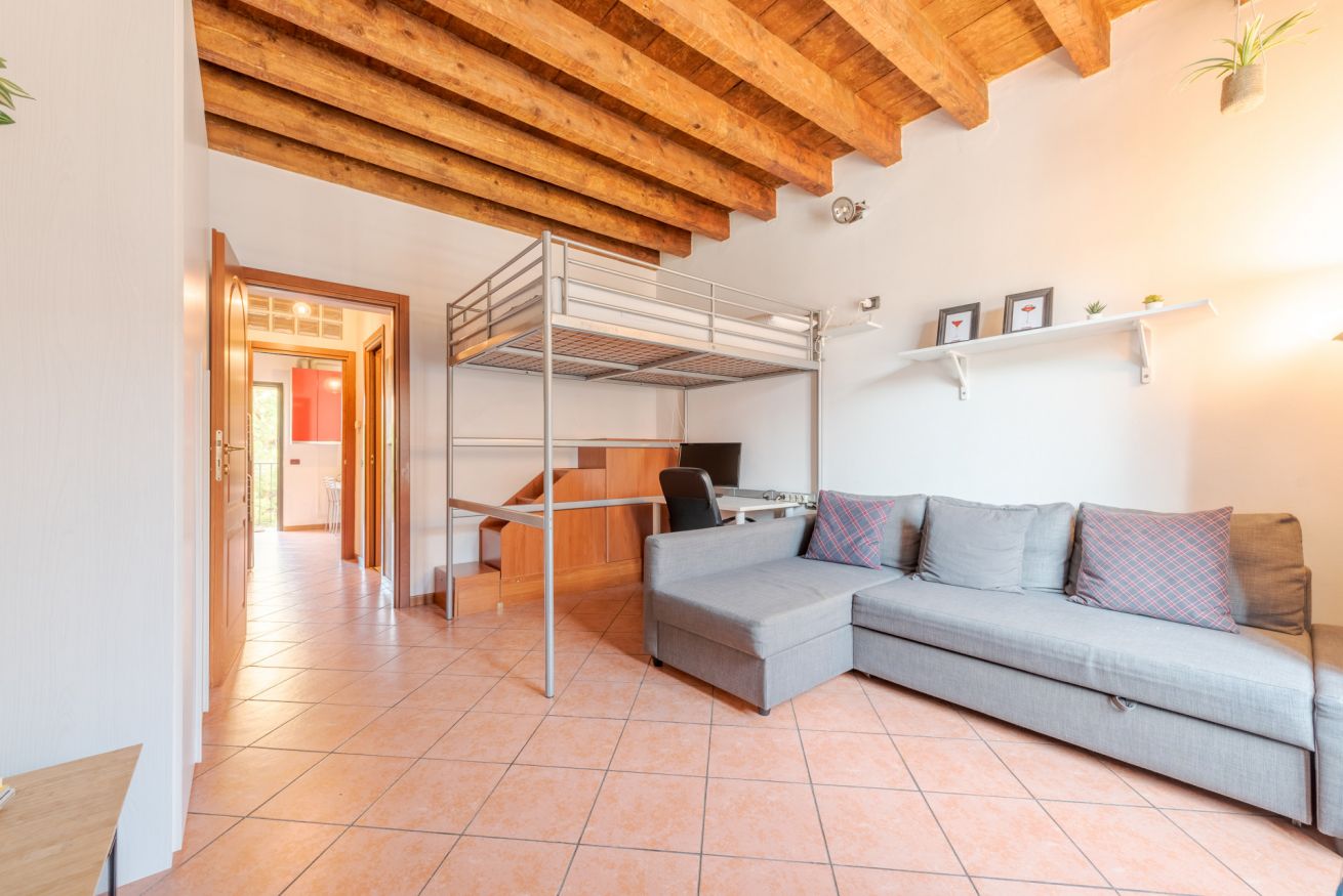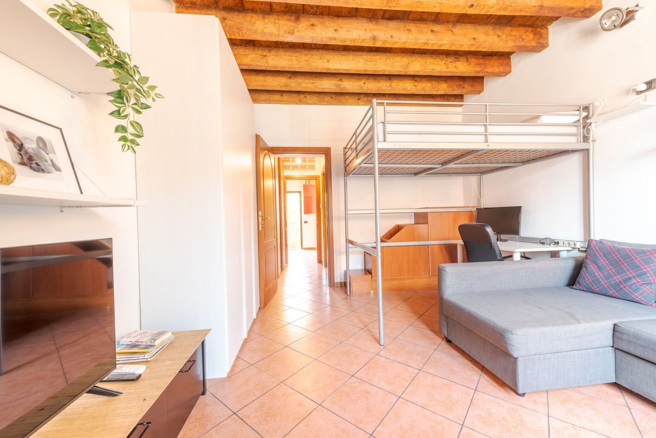 L'appartamento è un grazioso bilocale con camera da letto e salotto nello stesso ambiente ma ben separati grazie al letto soppalcato.
